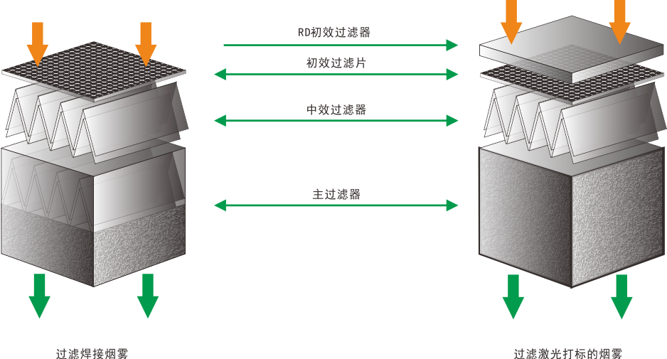 首先有害煙霧經(jīng)過(guò)初效過(guò)濾片,濾除較大顆粒物質(zhì);